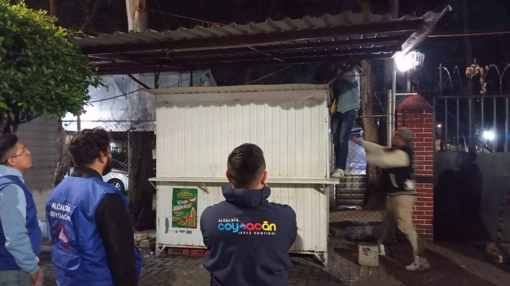 En coordinación con personal de Escudo Coyoacán y de Vía Pública perteneciente a la Dirección de Gobierno, se retiró un puesto semifijo en donde aparentemente se vendía comida pero que en realidad, servía como cantina o bar en la banqueta, pues los clientes se escondían dentro y estaban cubiertos con una carpa para ingerir bebidas alcohólicas”, comentó.